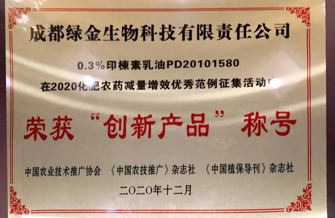 綠金生物印戀0.3%印楝素乳油榮獲“創新產品”稱號