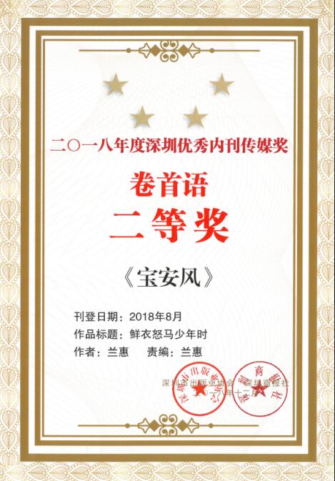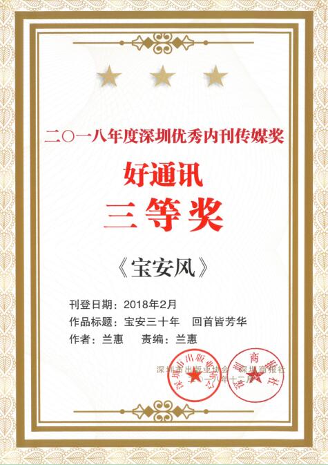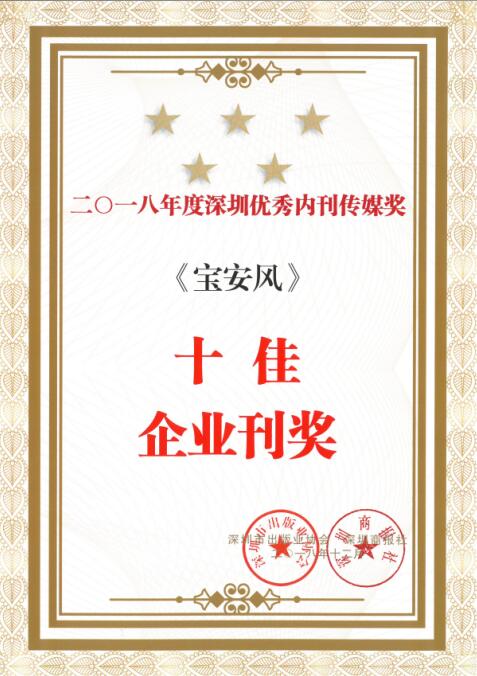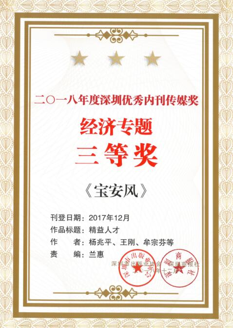 深圳內刊年度綜合獎“優秀內刊傳媒獎”,由市出版業協會、深圳商報聯合組織深圳市新聞出版廣電局等資深文化傳媒專家評定,每年評選一次,代表著深圳內刊的最高榮譽。《寶安風》在強手林立的深圳內刊界再接再厲,再次獲評“深圳優秀內刊傳媒獎”之“十佳企業刊獎”。同時,282期“精益人才專題”獲“經濟專題”三等獎,286期卷首《鮮衣怒馬少年時》獲評“卷首語”二等獎,283期通訊“寶安三十年 回首皆芳華”獲評“好通訊”三等獎。