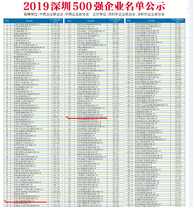 深圳500強企業公布 集團入圍百強 貝特瑞排153位